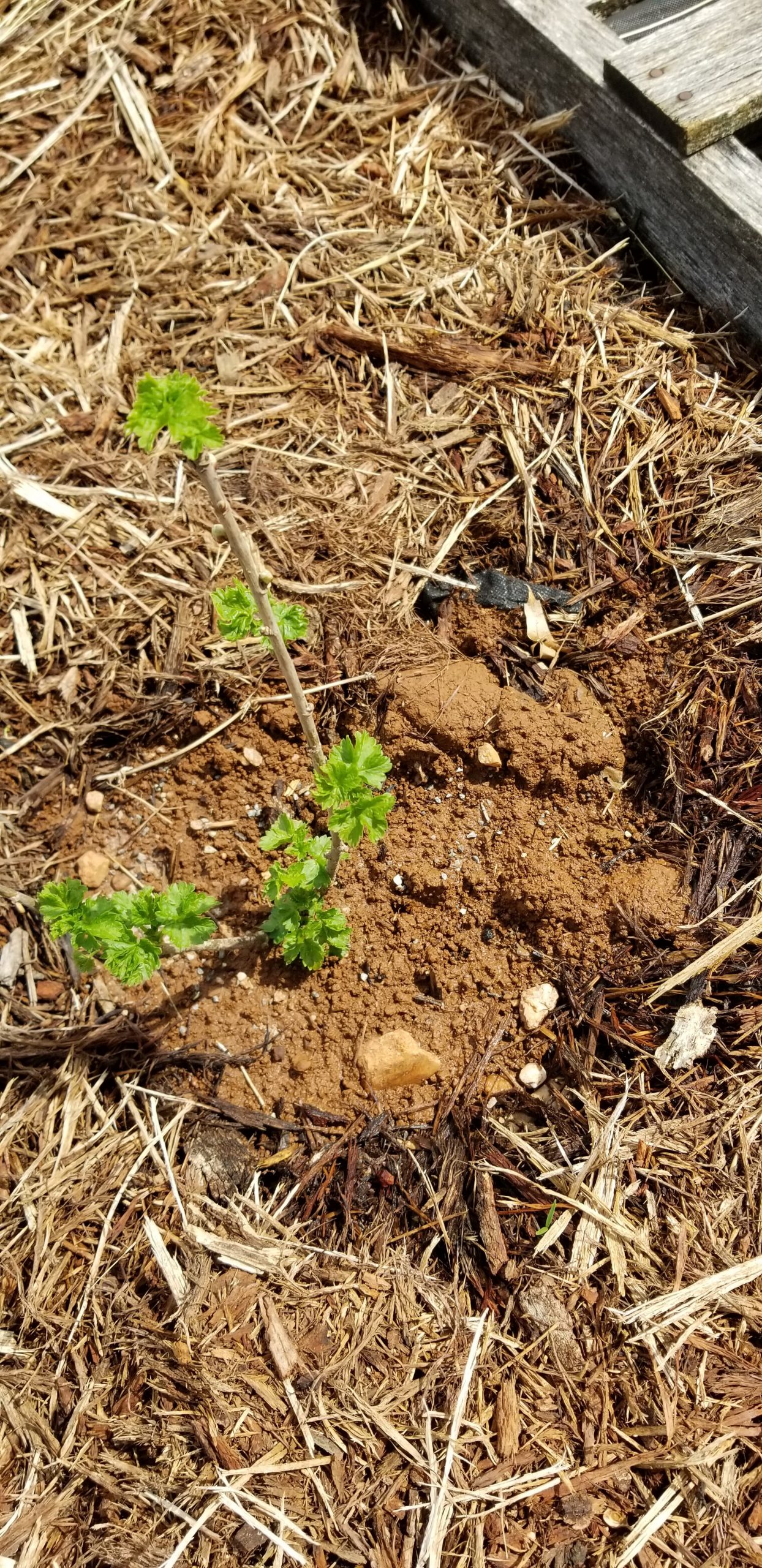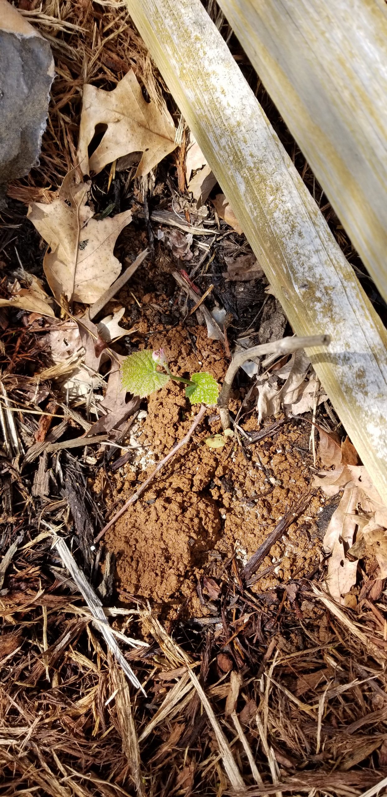 One of the grapevines is starting to get some green on it.