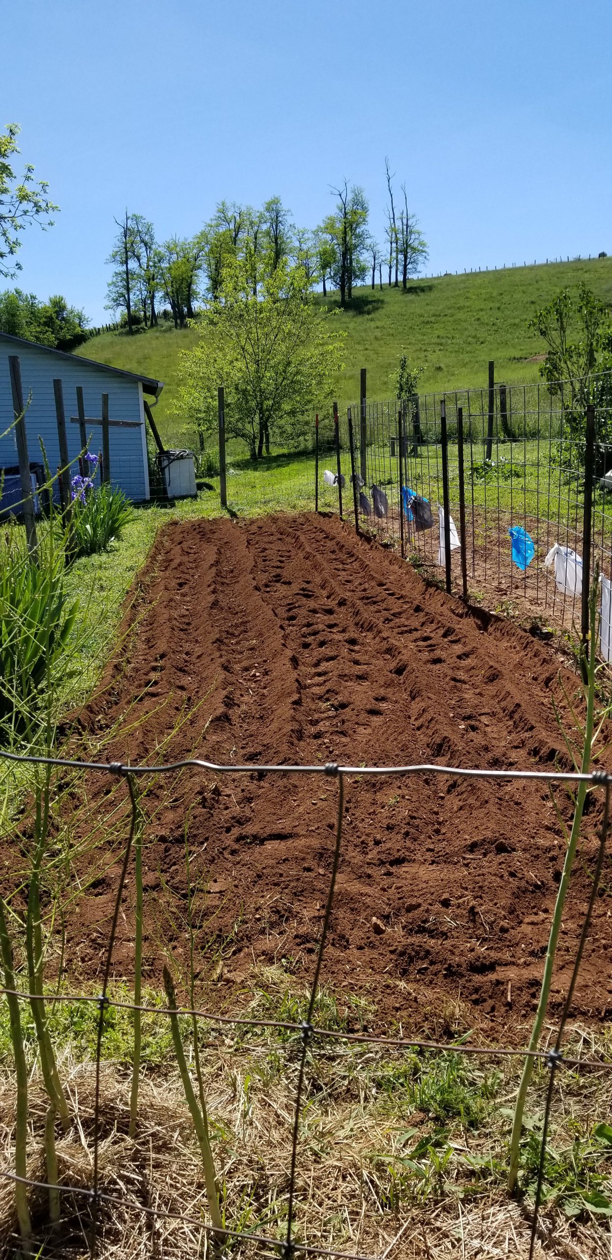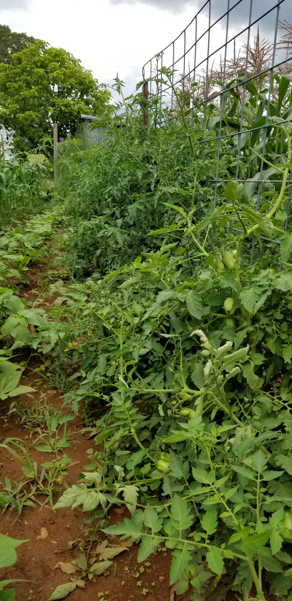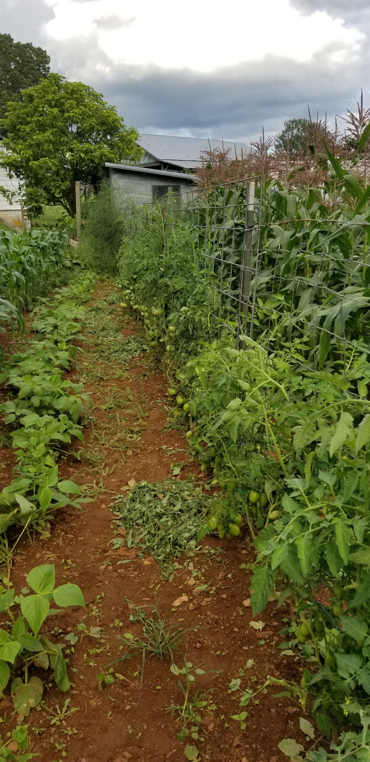 On each side of the tomatoes are beans and corn. I planted these about two weeks apart in hope’s of spreading out the harvest. Asparagus bed is at the end of the row.