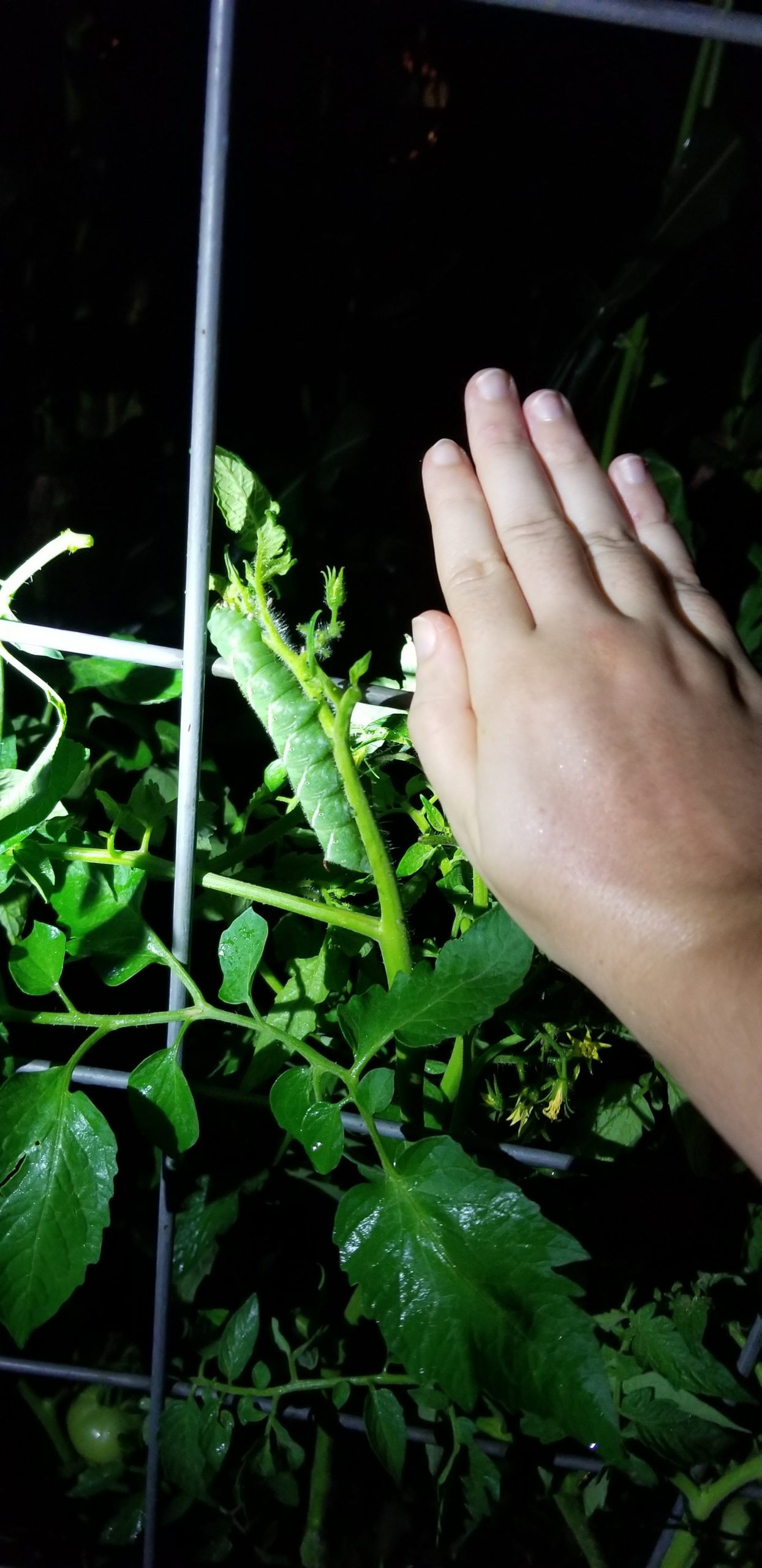 One of the the things we are battling right now is tomato hornworms. David fixed us up two black lights and every night Grace and I go hornworm hunting. So far we have found five. They are huge. I do not want them to destroy our tomatoes. They can do so much damage in a short amount of time.