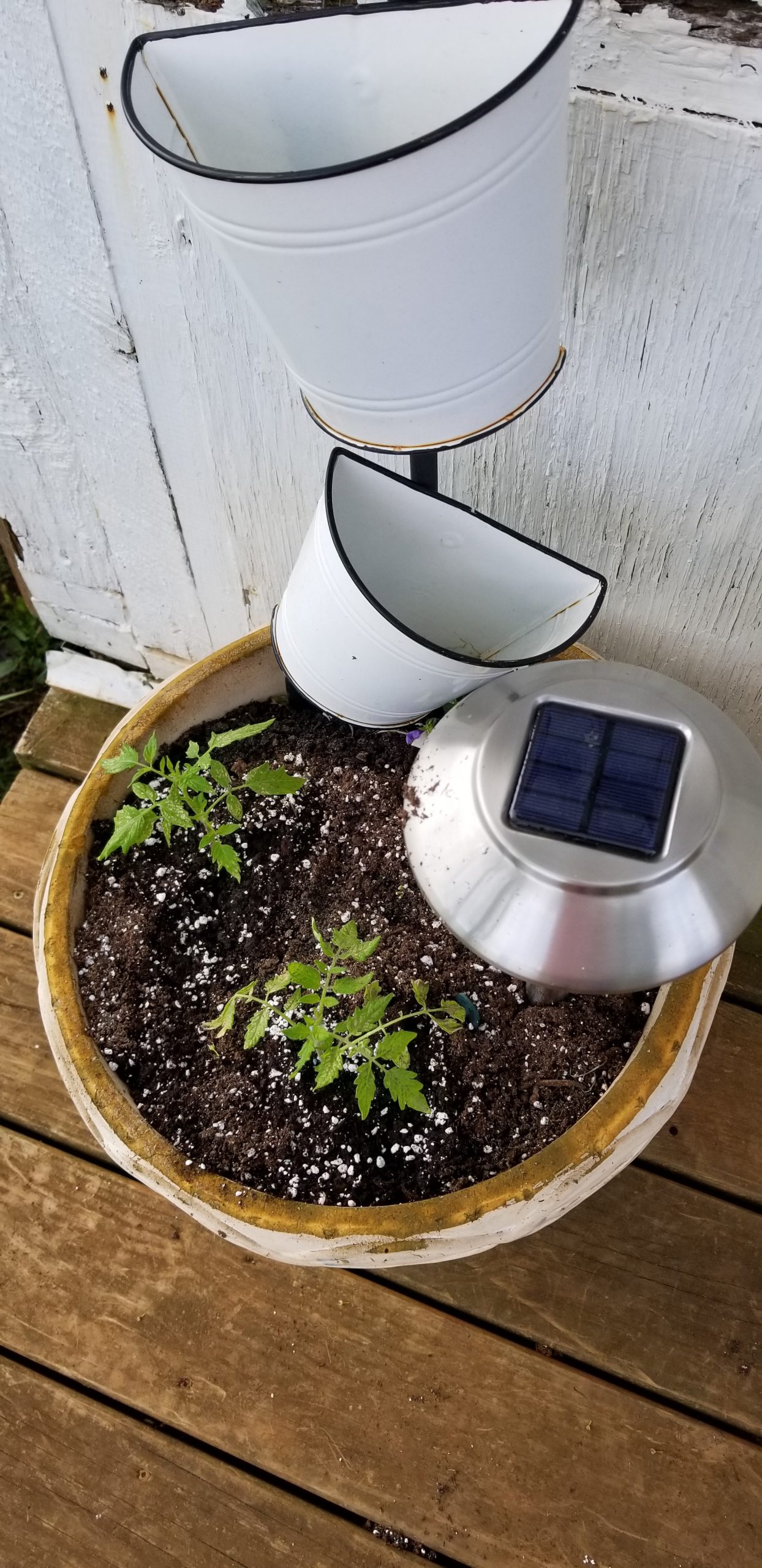 I also put two cherry tomatoes in these pots. I am not putting any pots up in the garden. Way to much work to water them. But these are here on the deck. I can just water them when I water the flowers.