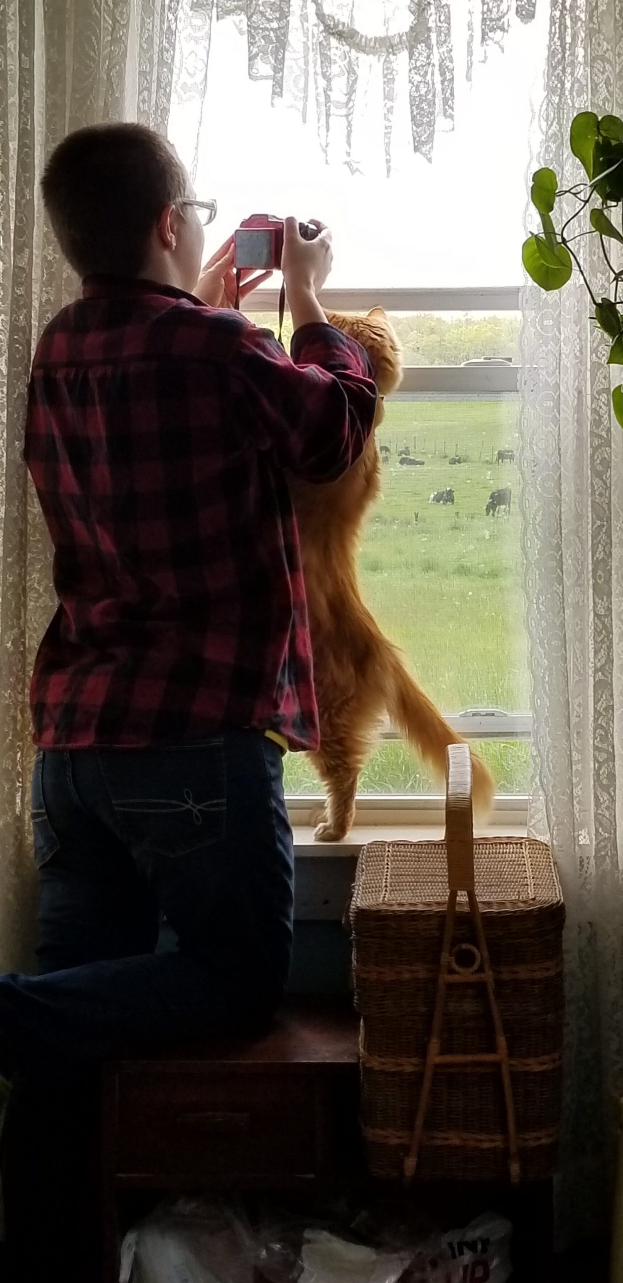 The baby geese hatched out at the pond. Grace is getting pictures of them. Juicy is helping. He is a very curious cat, always seeing what is going on.