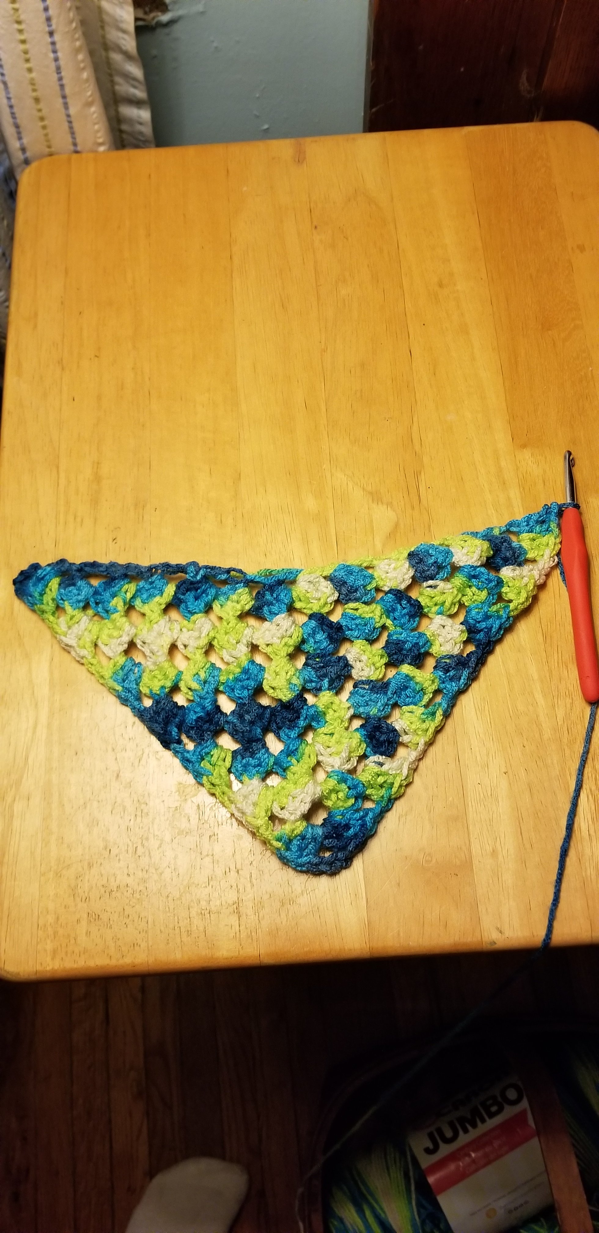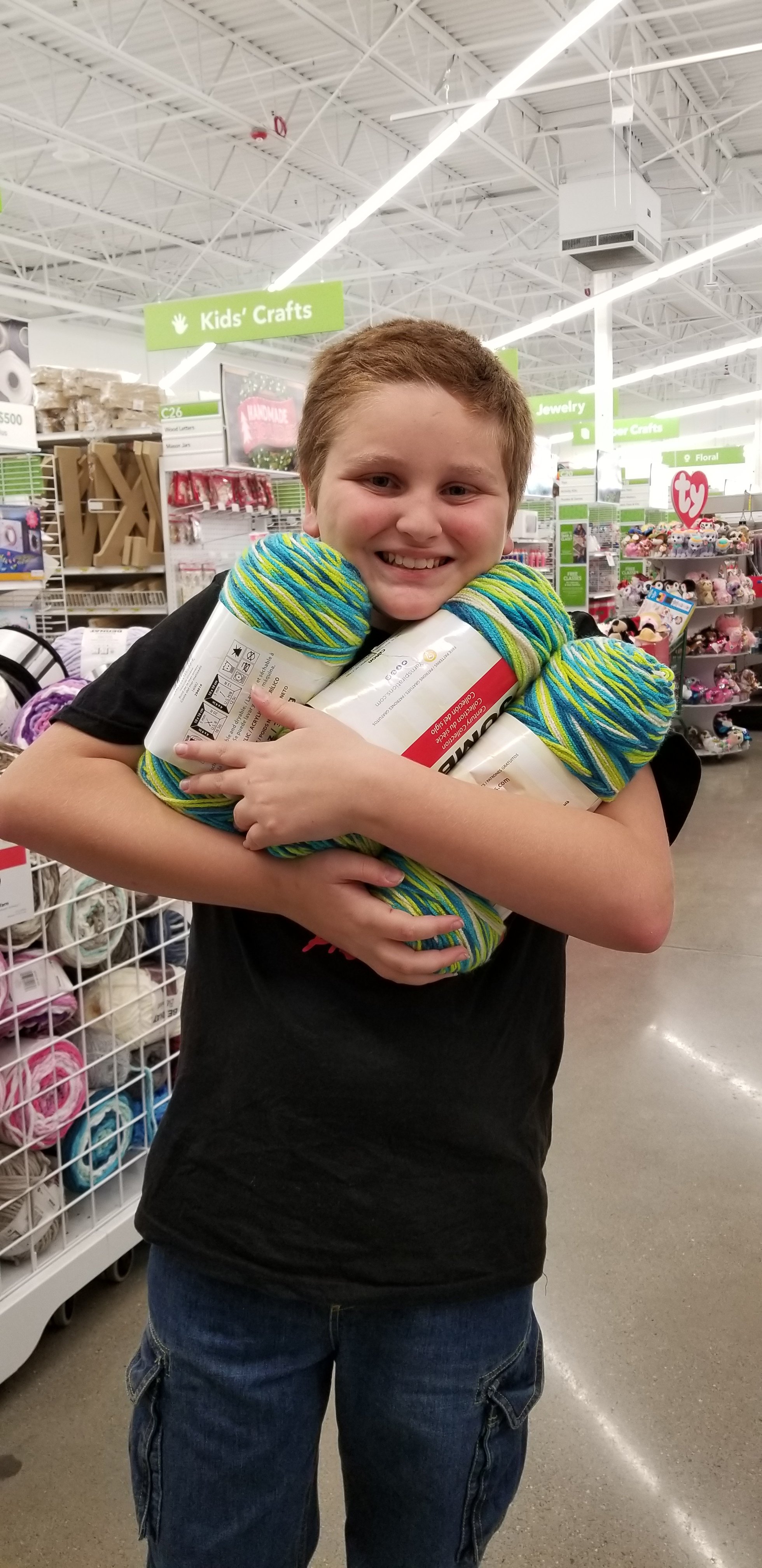 When he saw his mom’s shawl I made her, he said he wanted me to make him one. We went in search of the yarn he wanted to use. It took us a while to find it. We went to Michael’s first but they didn’t have what we were looking for. We then went to Hobby Lobby only to remember they are closed on Sundays. Last stop was Joanns. We found the colors he wanted there and it is very soft yarn.