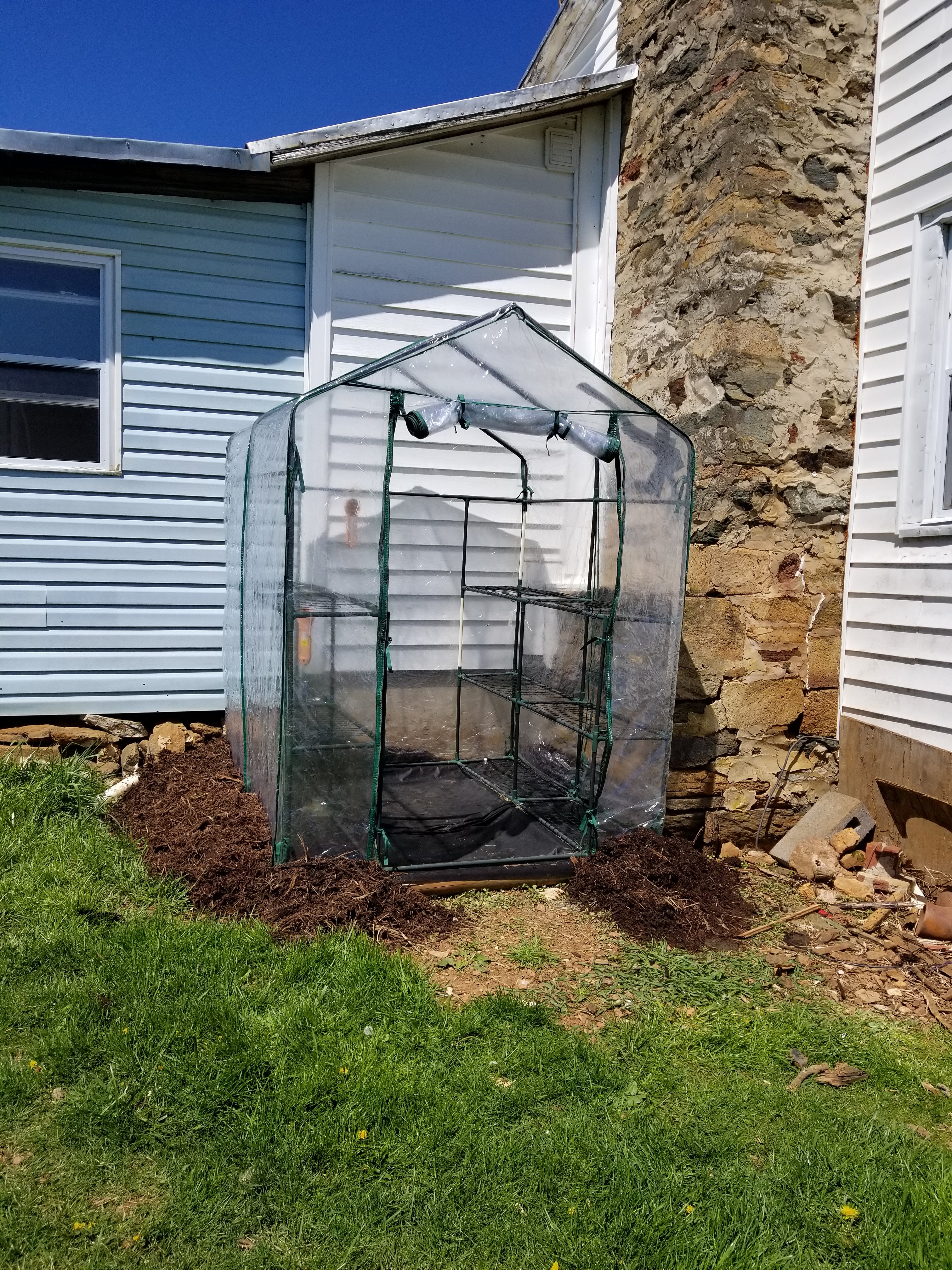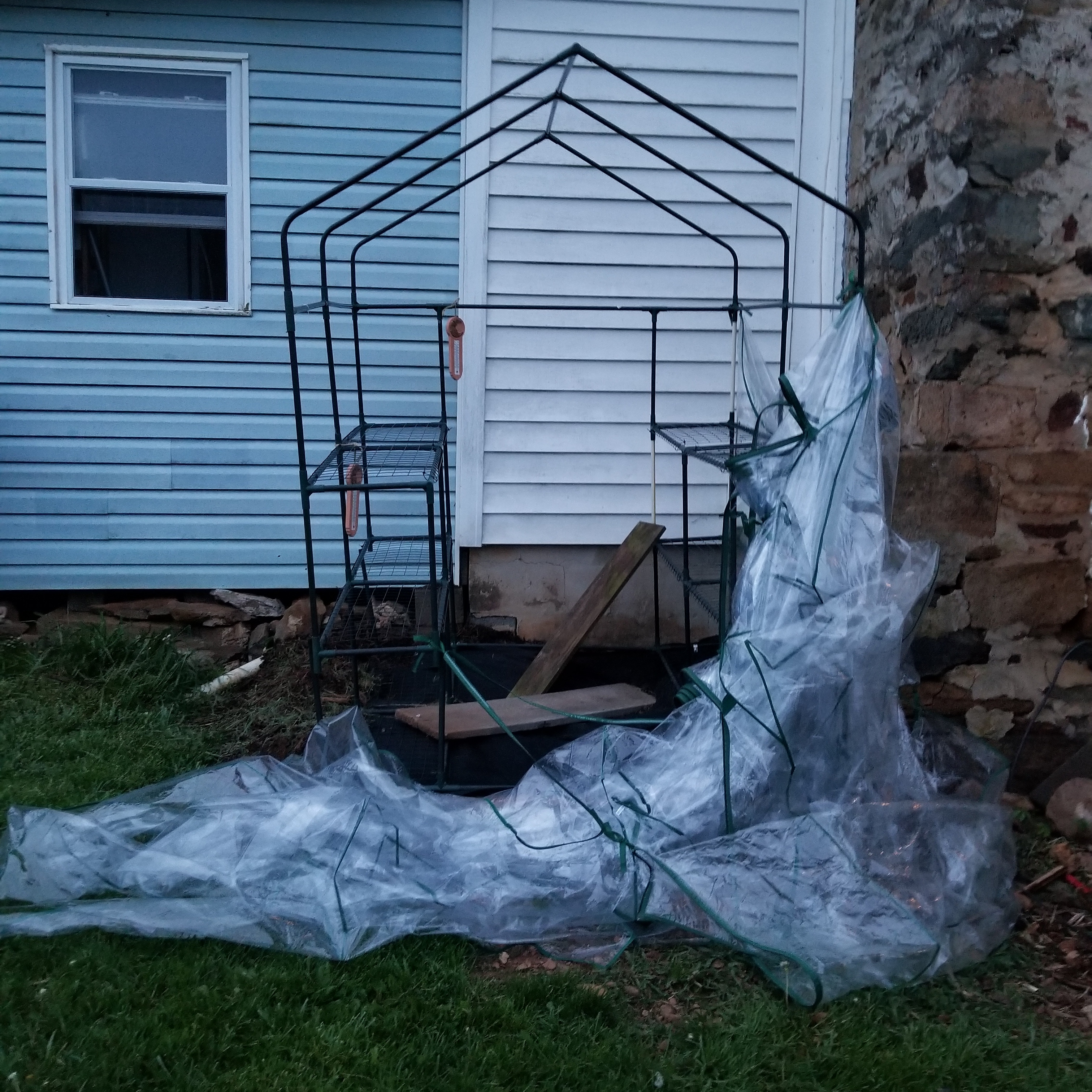 High wind destroyed the cover on the big greenhouse again. Thankfully no plants were in it. It definitely needs a better plan to be usable. Oh well, the smaller greenhouses worked great inside the porch. I’ll probably just use them again next year.