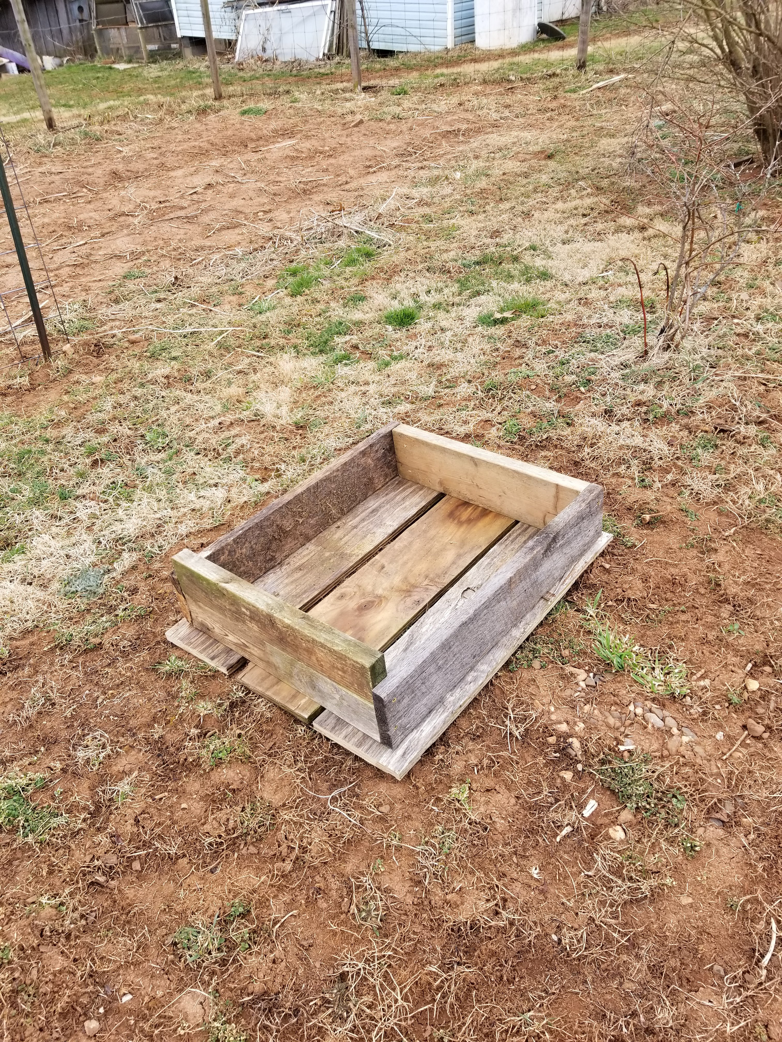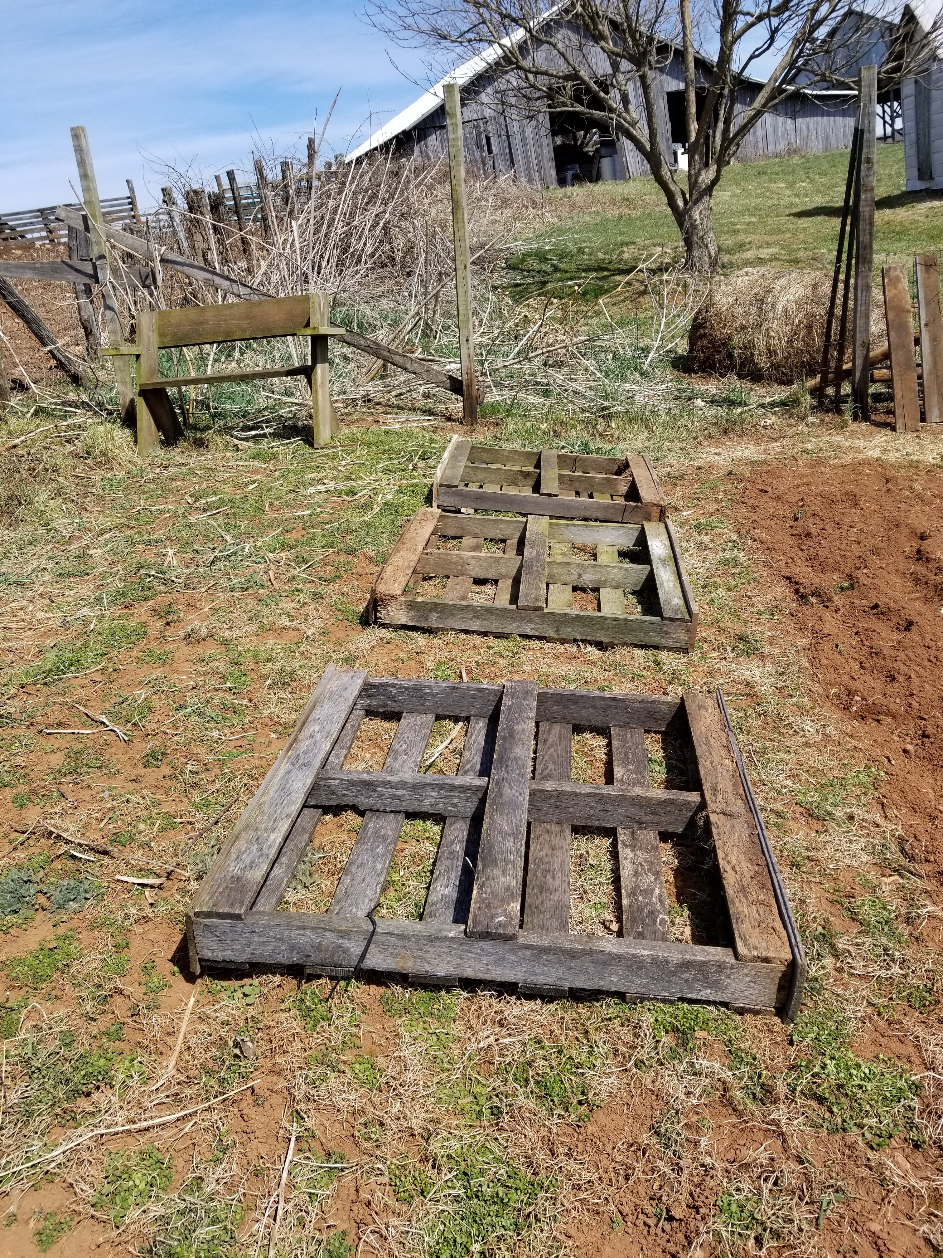 Next I took down my old compost bin. It was coming apart and I want to make something different for compost anyway. It was made of these old pallets. When I took it apart, I thought I could do something with them. So I cut a board to fit the ends of the pallets so the dirt wouldn’t fall out and I am going to use them for spring plants. I know they won’t last too long but I hope to get a few years out of them.