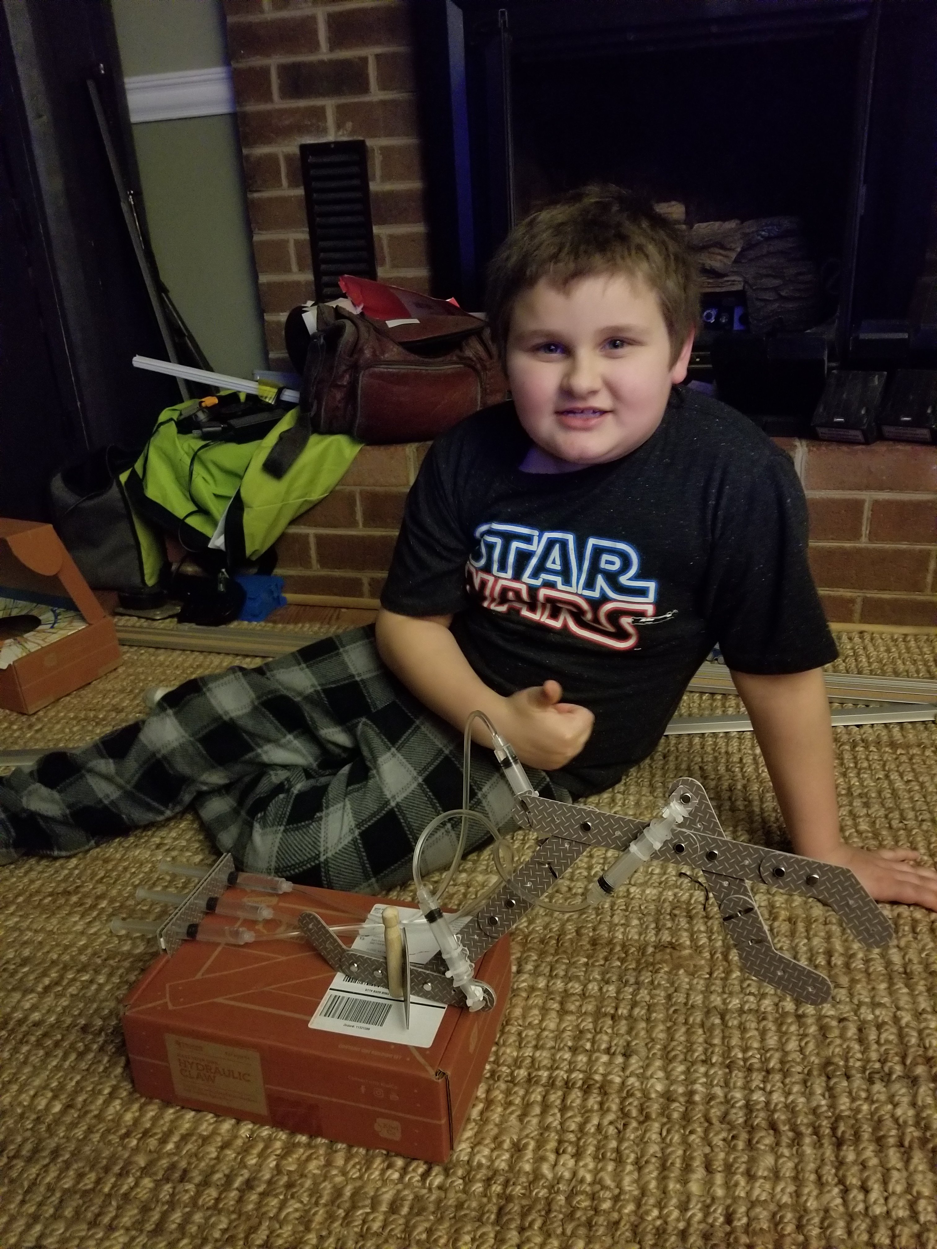 This is Sam and his robotic arm that he made with his Tinker crate. He did such a good job!
