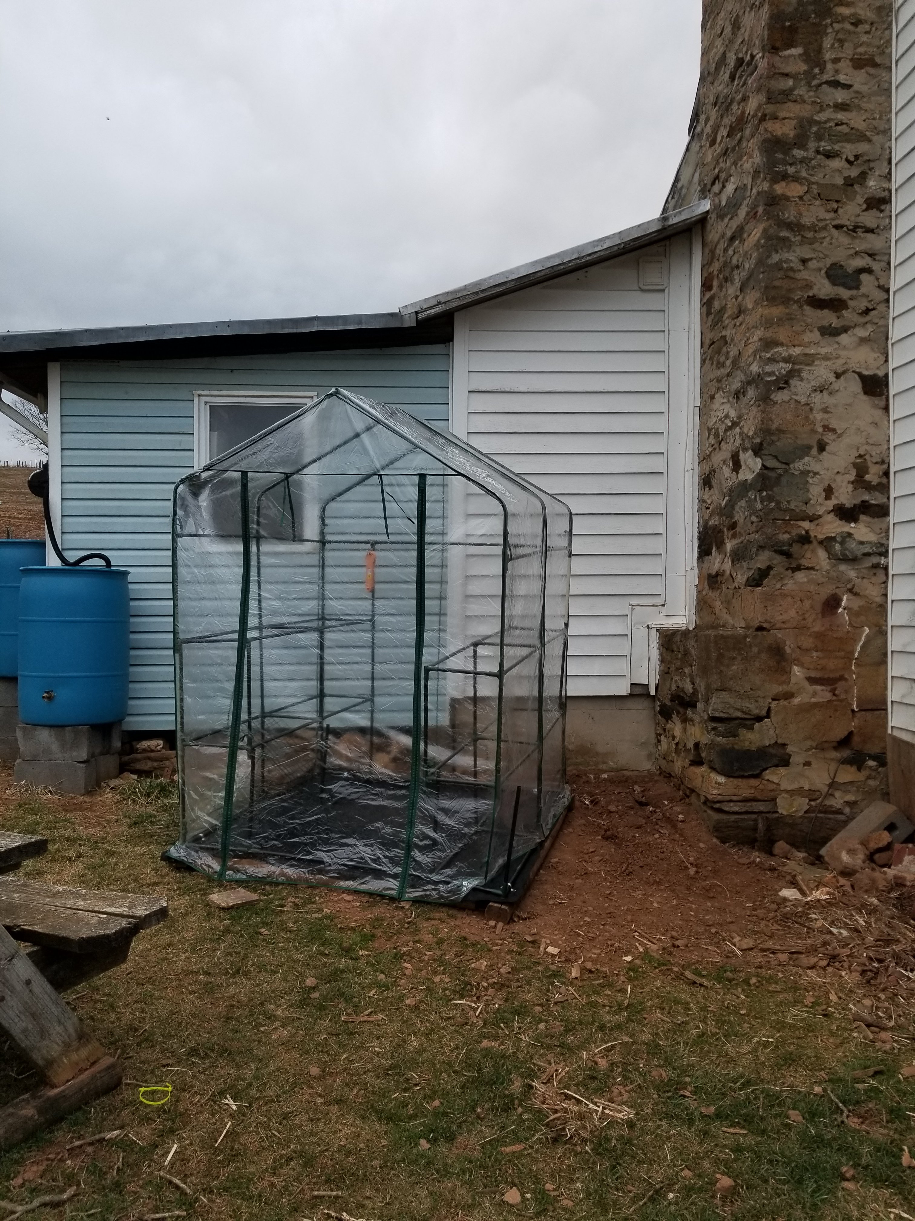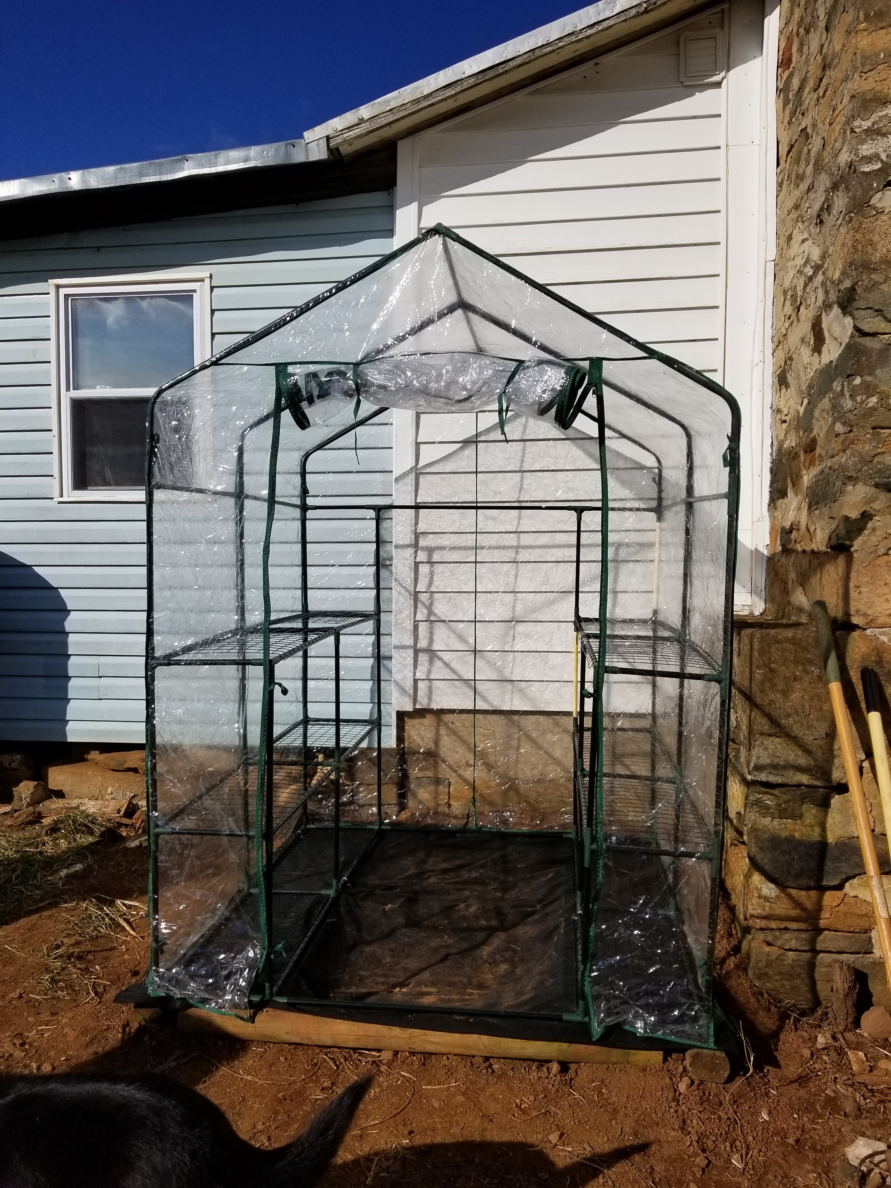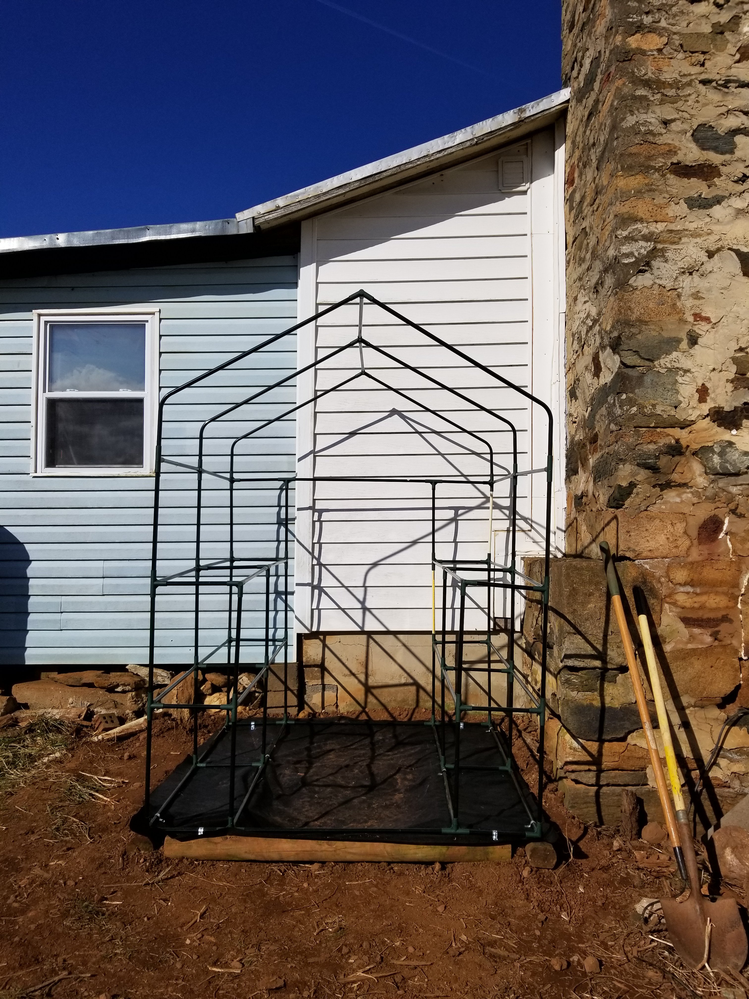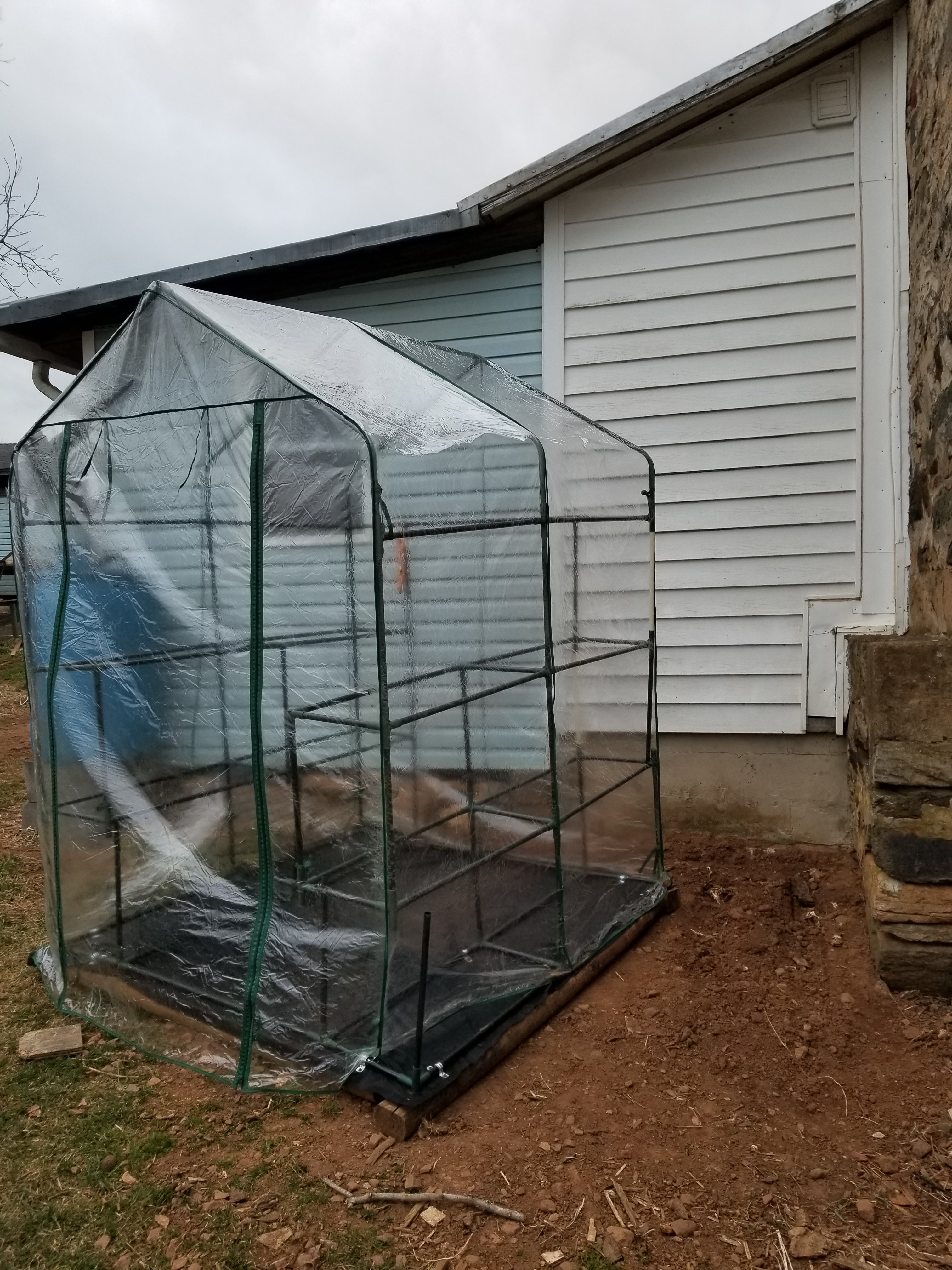 Dave and I spent the day outside working on projects. It was a warm sunny day. Beautiful. We put up the bigger greenhouse. It started out looking like this.