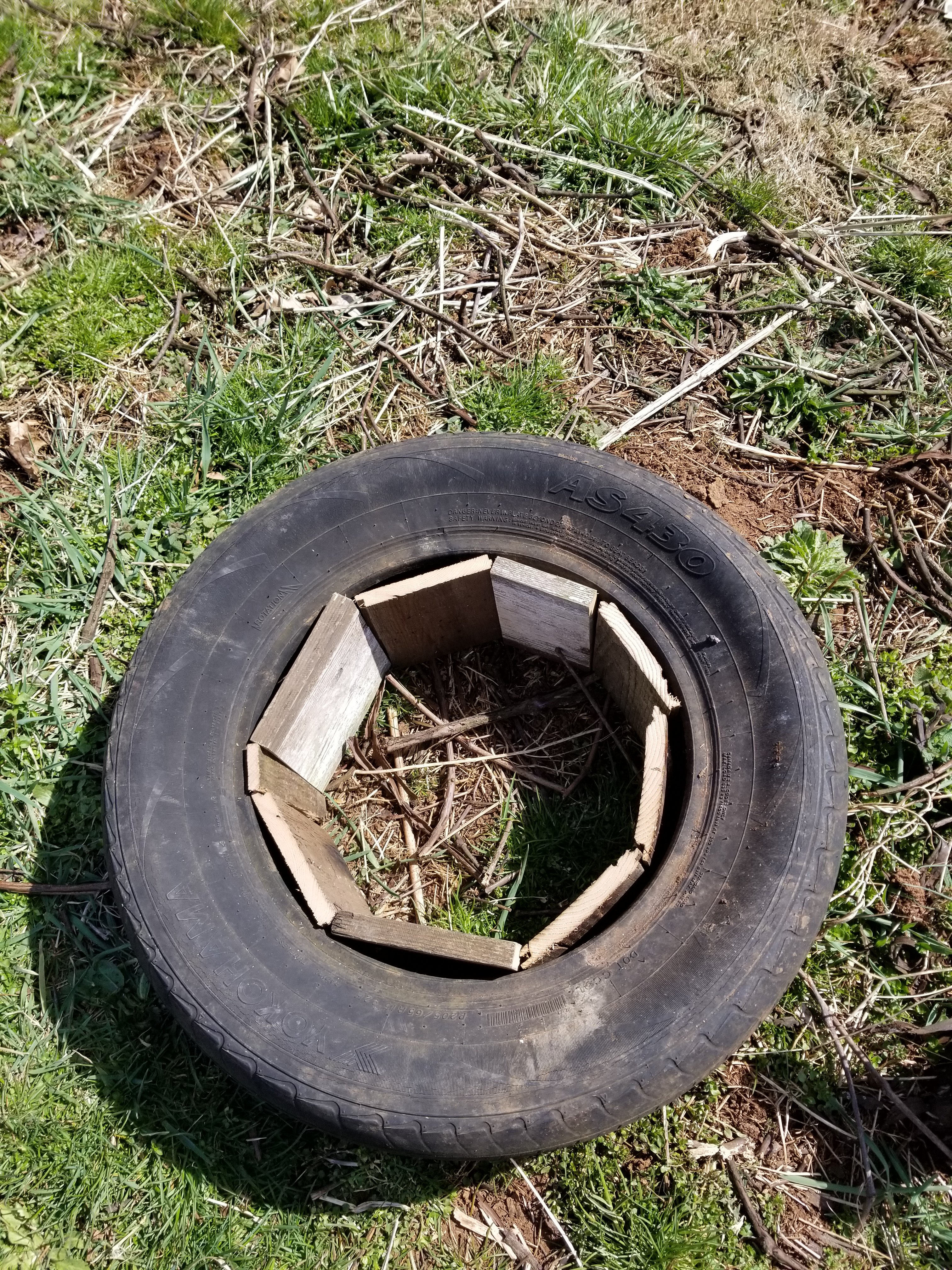 Then it occurred to me how much dirt it would take to fill them up so I cut wood pieces to make a barrier so I don’t have to fill up the inside of the tire.