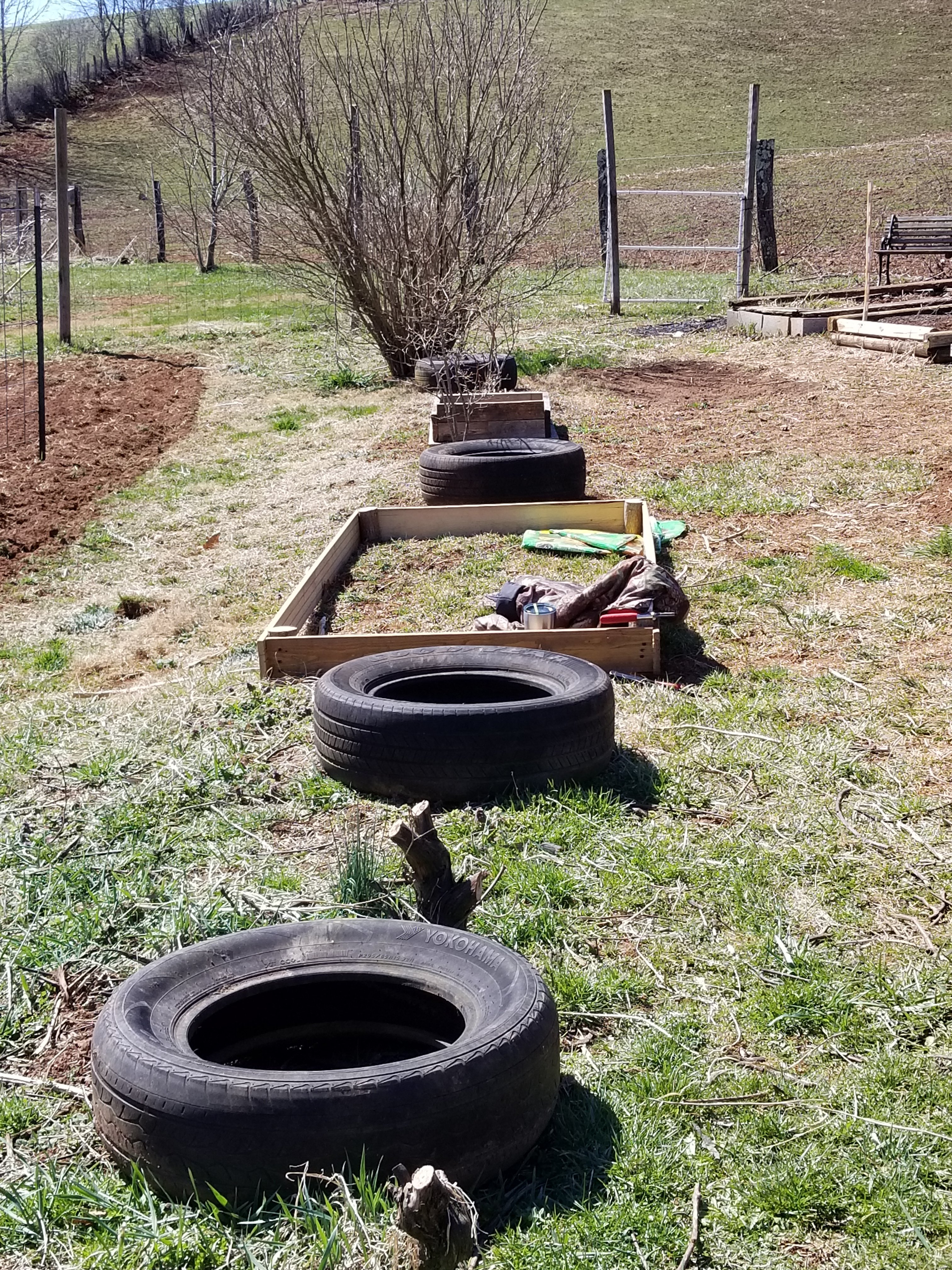 Dug these tires out from the fenceline and put them down along the path. I plan to put flowers in them.