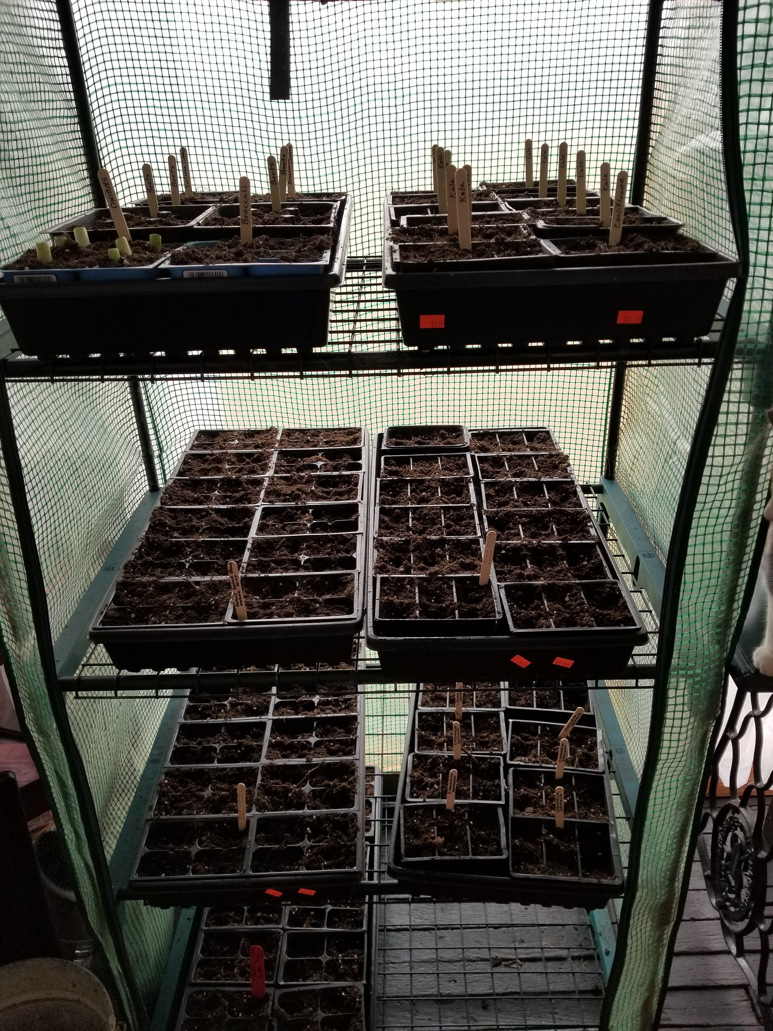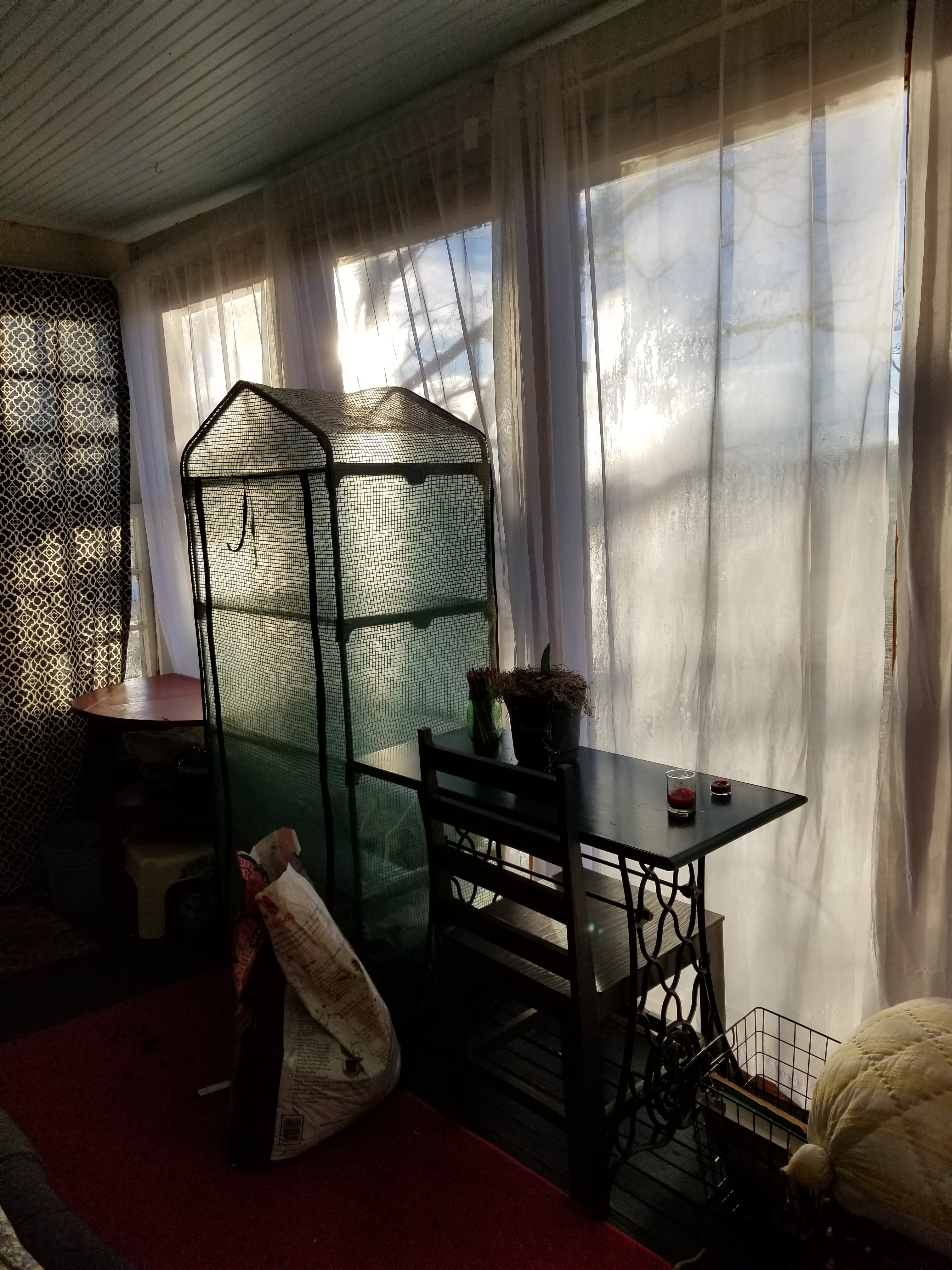 Grace carried my small greenhouse to the front porch for me. Sorry the pic is a little dark. I am looking forward to starting some greens in here hopefully next week. I want to start some lettuces, kale, chard, spinach, radishes and onions. Salad fixings.