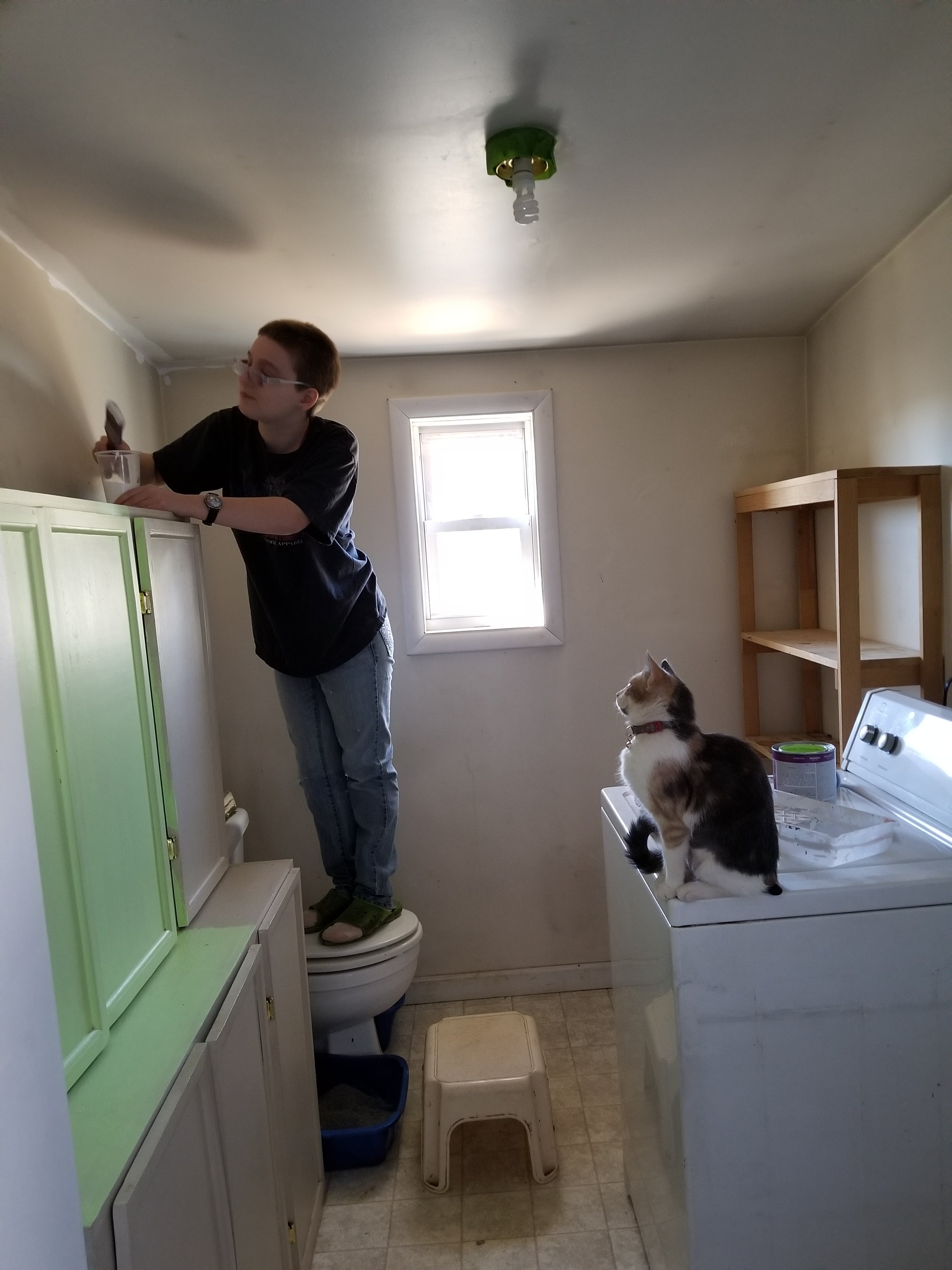 We have had a wet week so Grace and I decided to do an inside project. We painted what we call the “new room”. This room was added a few years back. It is a combination room. As you can see our washer is in there and extra commode, plus storage. Grace has a curious helper!