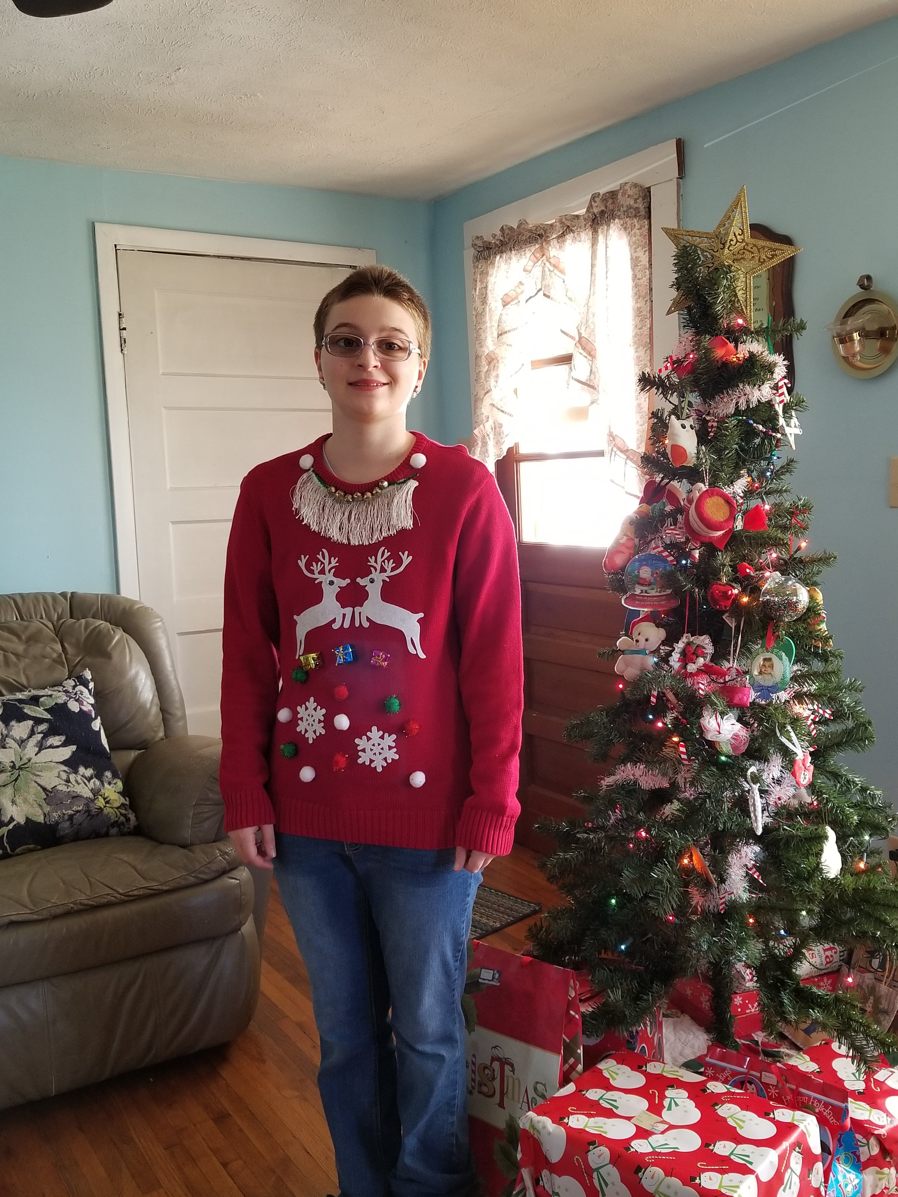 Grace loves to wear her Christmas sweaters. This is one of her favorites. It has jingle bells on it. She also had on Christmas socks that had bells on them. So much fun!