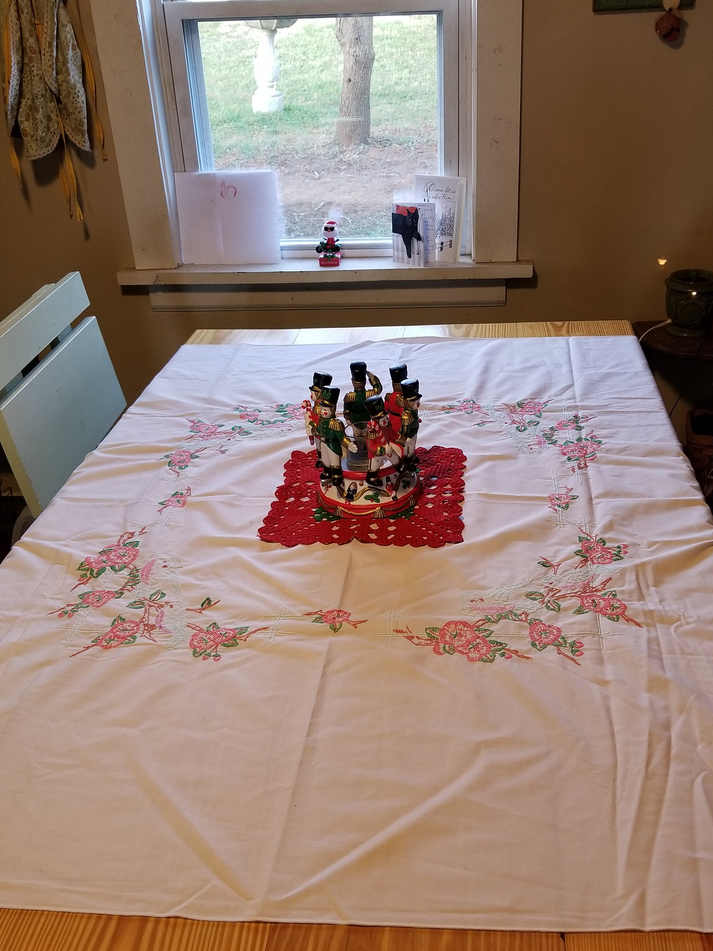 I always like to get this tablecloth out for Christmas. My mom and I embroidered it together. I did one side, mom did the other. I wanted to quit working on my side. Needle work has never been one of my favorite things. Mom wouldn’t let me and I am so thankful I finished it. Every time I get it out to use, I remember how much fun we had working on it.