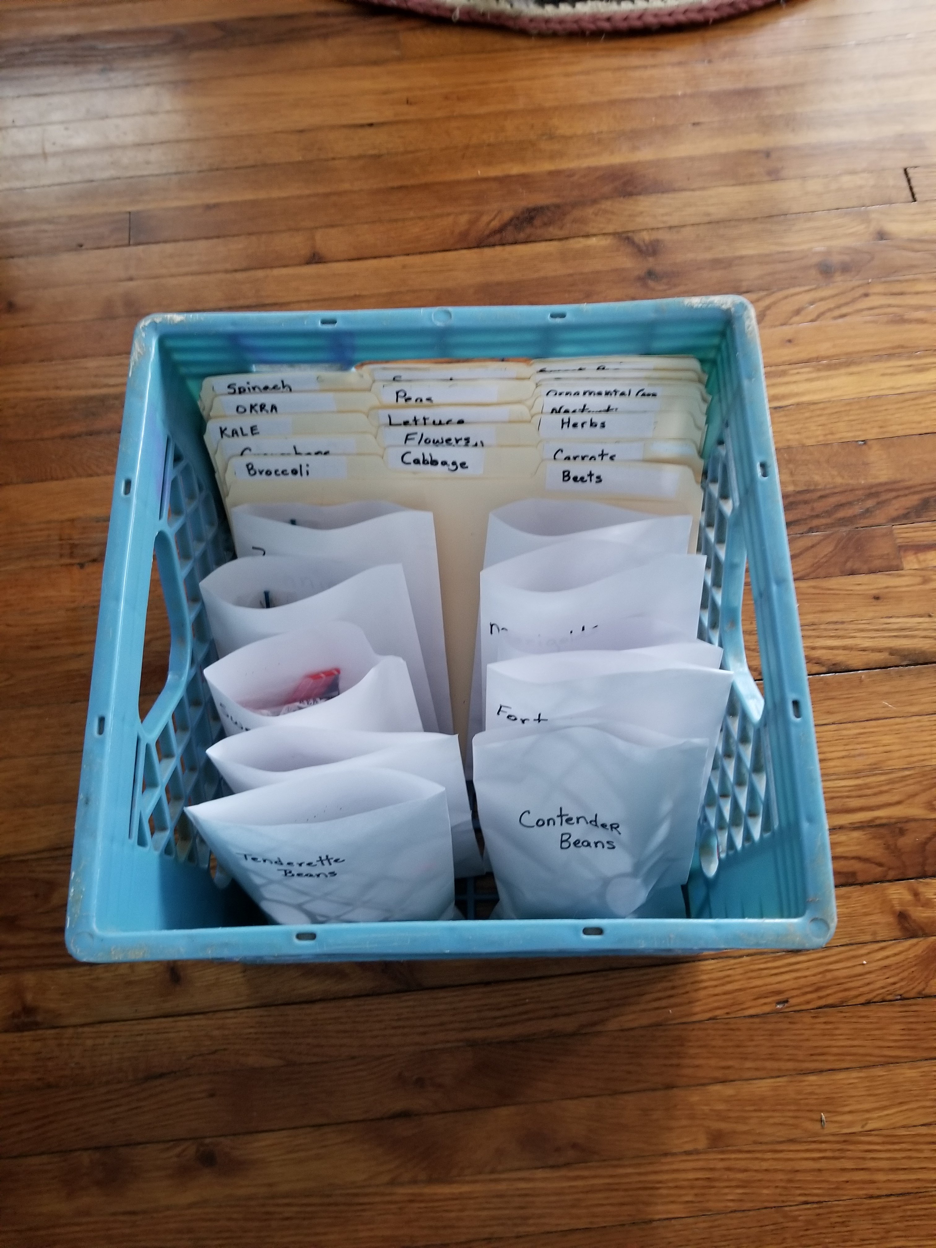 Then I made file folders for them and put them in alphabetical order. I made the larger envelopes you see in front for my bigger seed packets. I always buy corn and bean seed in bulk.